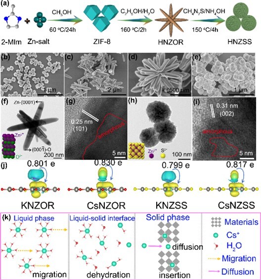 基于上述策略,將十二面體ZIF-8定向轉化為無碳氮摻雜氧化鋅棒(HNZOR),并進一步將其轉化為硫化鋅球(HNZSS)。與傳統煅燒方法相比,該方法有效抑制了金屬團聚,充分暴露活性位點,并形成了具有高表面積的非晶區域(HNZOR為203.9 m2/g,HNZSS為61.7 m2/g)。這些特性協同增強了傳質能力,并在吸附劑骨架中形成強結合力,從而實現了優異的吸附性能。K?活化后的吸附劑(KNZOR和KZNSS)展現出快速吸附動力學和高吸附容量(分別為275 mg/g和302 mg/g),克服了競爭離子干擾,在復雜環境中對Cs?具有優異的選擇性。在實際水樣中,它們表現出卓越的吸附效率,KNZOR和KZNSS的分配系數(Kd)分別達到2061.85 mL/g和2578.31 mL/g。在實際柱操作中,KNZOR和KZNSS在連續流條件下可實現近定量(約99%)的Cs?回收。研究結果以“In-situ sequential topotactic transformation of ZIF-8 to N-doped Zn-oxide/ sulfide with defect engineering for efficient radiocesium capture” 為題發表于Chem. Eng. J.(一區TOP)。